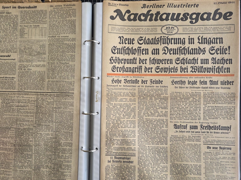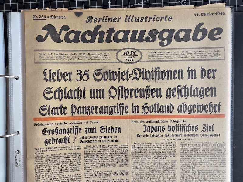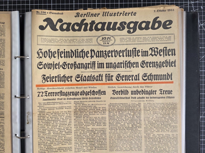 Dies ist eine schöne Sammlung von Belin-Zeitungen, geschützt in einem Ordner. Die meisten davon sind die Berliner Morgenpost, aber es gibt auch einige Berliner Illustrierte Nachtausgabe und Berliner Volkszeitung.