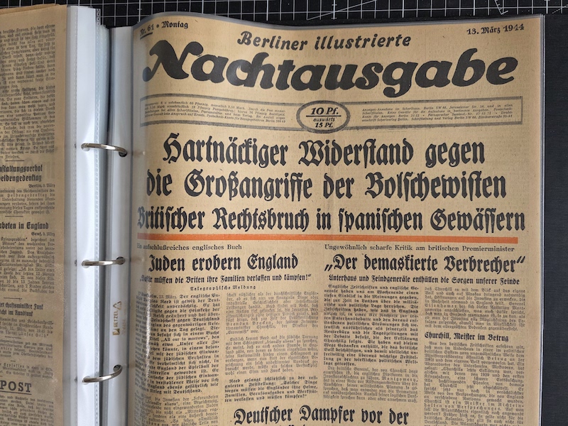 Dies ist eine schöne Sammlung von Belin-Zeitungen, geschützt in einem Ordner. Die meisten davon sind die Berliner Morgenpost, aber es gibt auch einige Berliner Illustrierte Nachtausgabe und Berliner Volkszeitung.